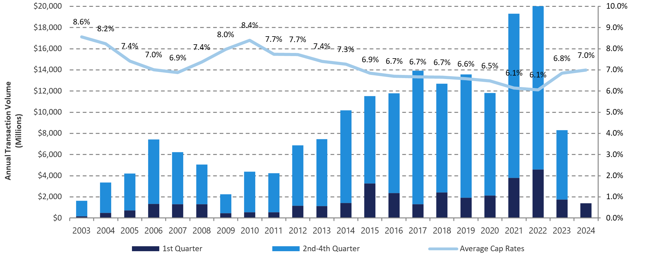 Despite a lackluster quarter with respect to transaction volume nationwide, the Midwest benefited from favorable demographic trends as the region outperformed its most recent quarter boasting $407 million in transaction volume—their best performing quarter since 2022. Additionally, the spread in cap rates among all regions tightened from 170-basis points last quarter to just 80-basis points with the West Region realizing the lowest quarterly average cap rate of 6.6-percent and the Mid-Atlantic experiencing the highest at 7.4-percent.